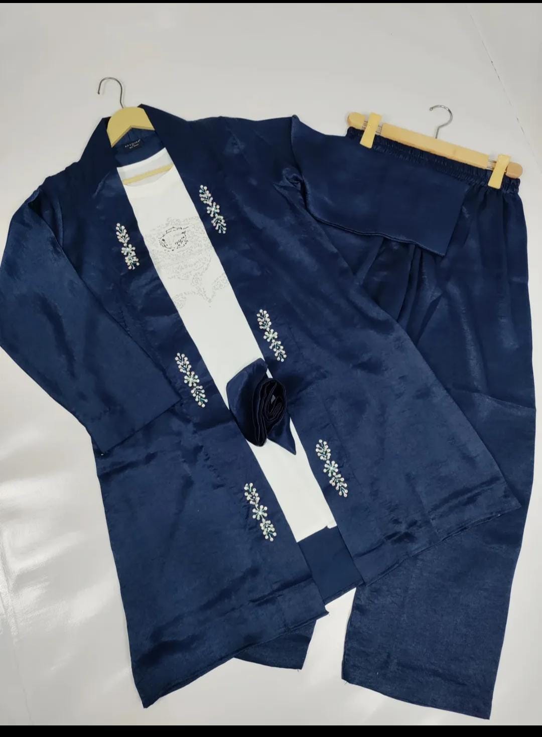 This elegant 3 PC short coat set is made from premium shemray fabric giving a smooth, soft, and classy look. The set includes a white inner shirt, a short embroidered coat with belt, and matching trousers creating a complete modern outfit.