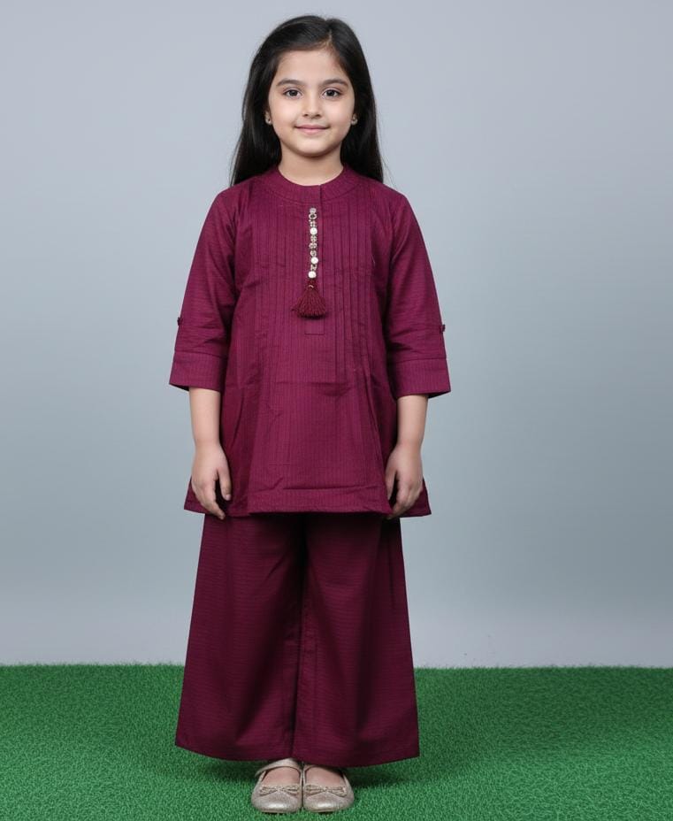 Give your girl a smart and stylish look with this premium cotton 2-piece suit, designed for ages 6 to 9 years. The shirt features neat pintuck detailing on the front along with a decorative tassel for a classy touch. The matching trouser completes the look with a comfortable and easy fit.